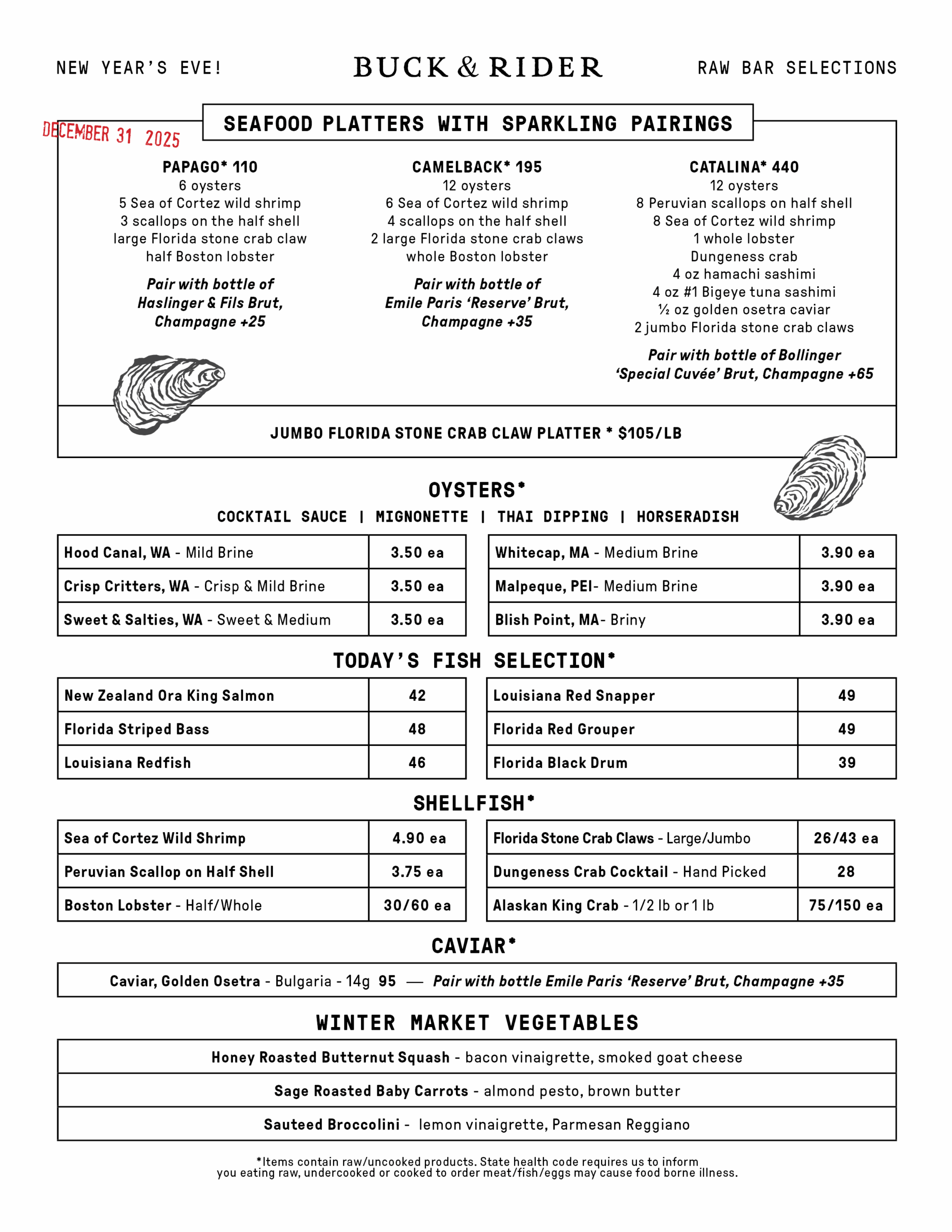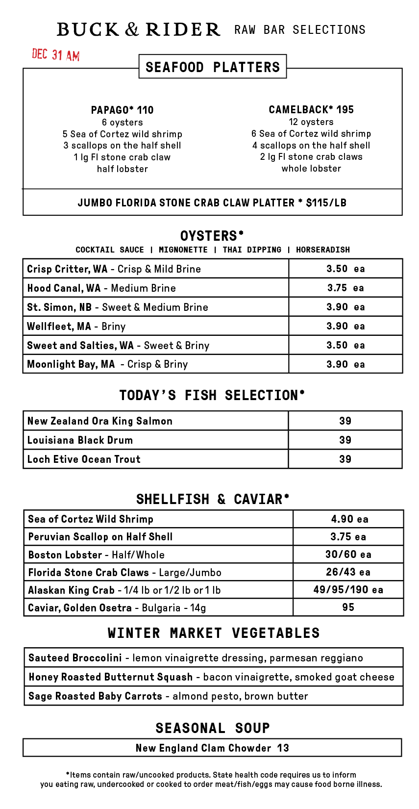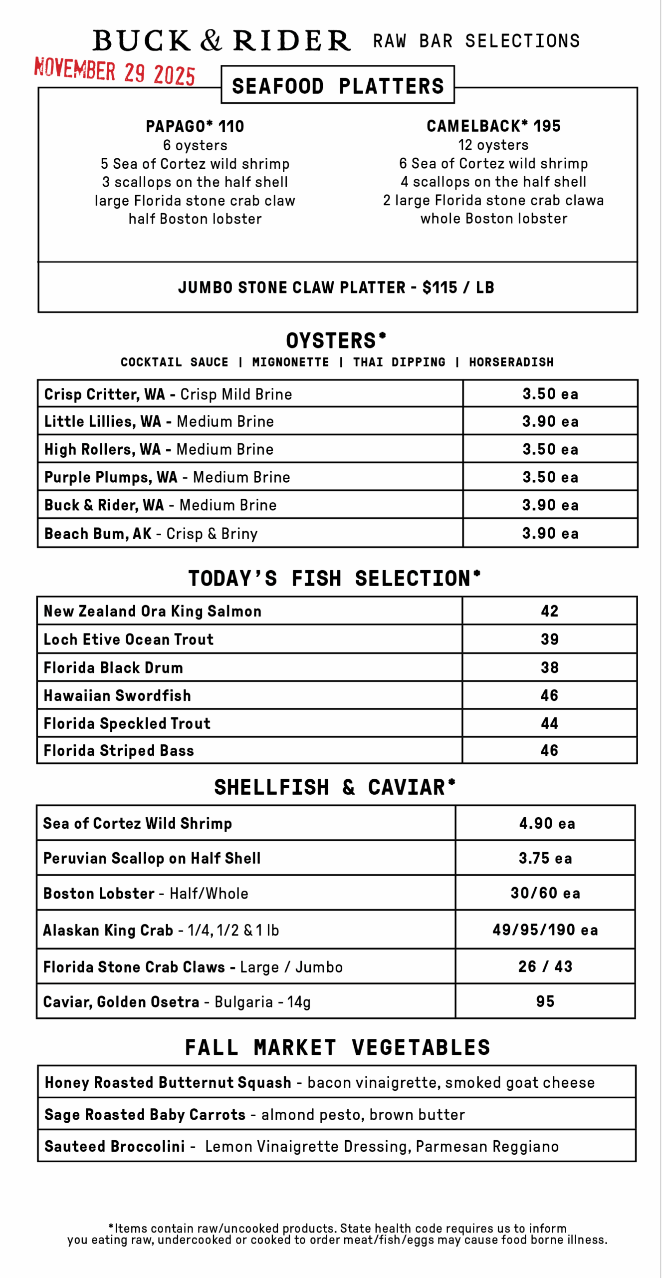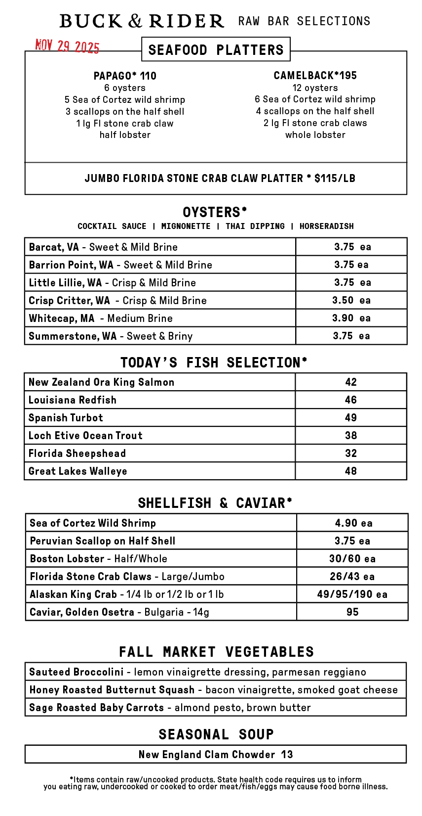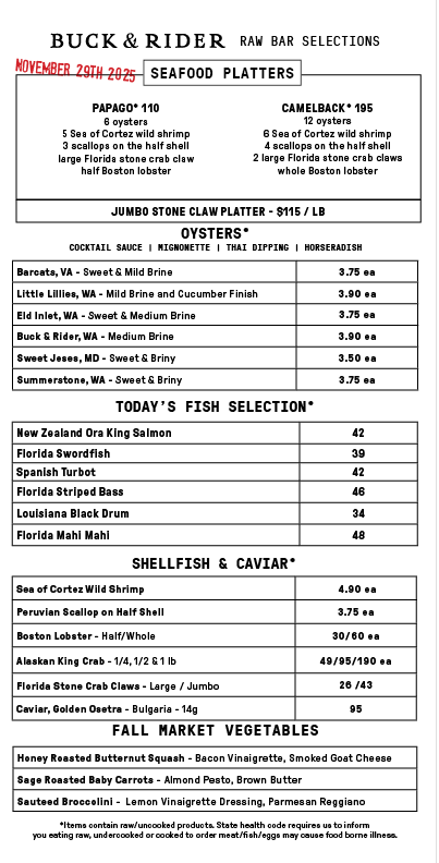 Our daily raw bar menu is time-stamped and continuously updated to reflect the freshness of our seafood and market vegetable selections.