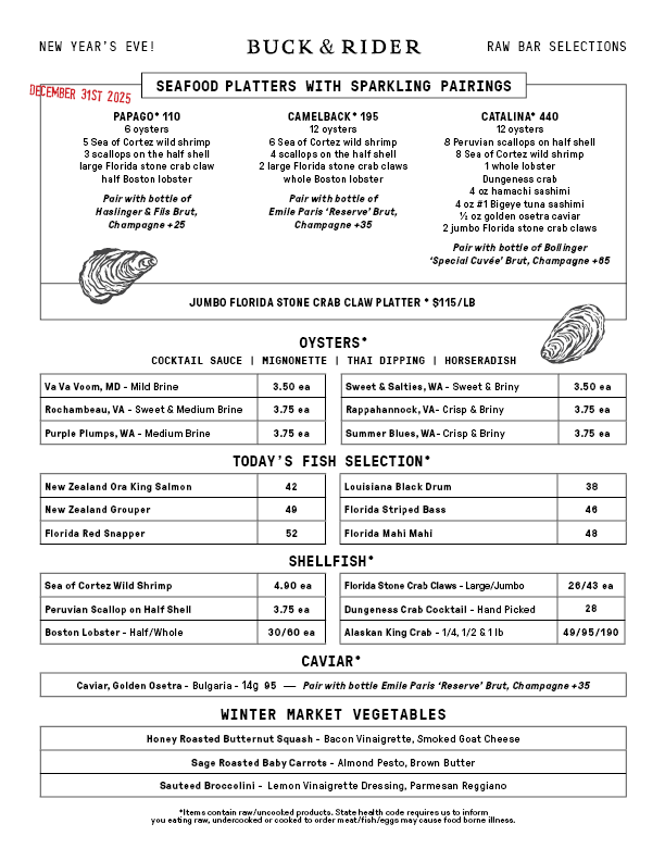 Walk-ins always welcome! Now that we have three Buck & Rider locations, we are thrilled to be able to accommodate more walk-ins. If you prefer to make a reservation, please note that reservations are seated in our Main Dining Room and heated/misted Patio. If you prefer a specific area of the restaurant, there may be a wait associated with your reservation.