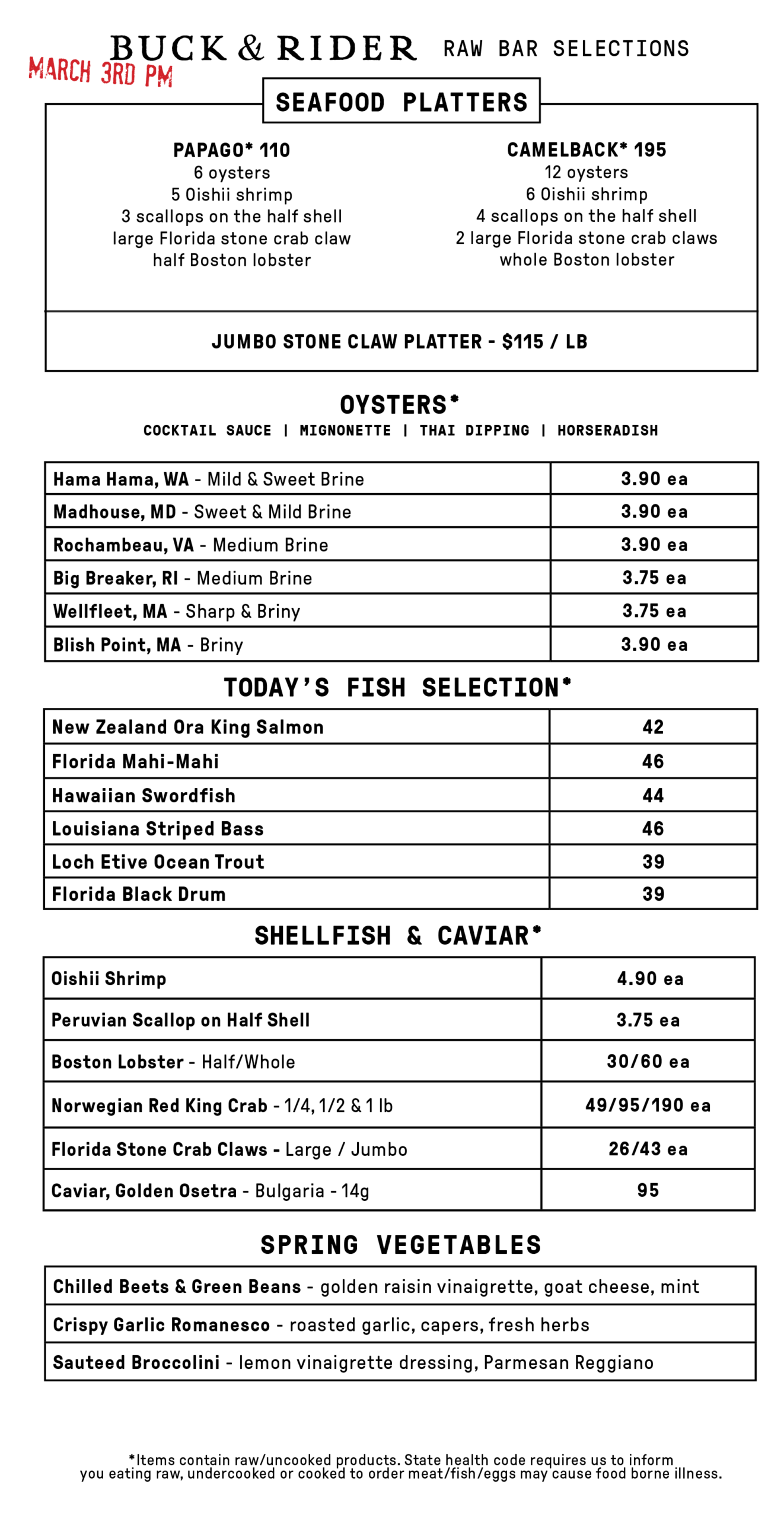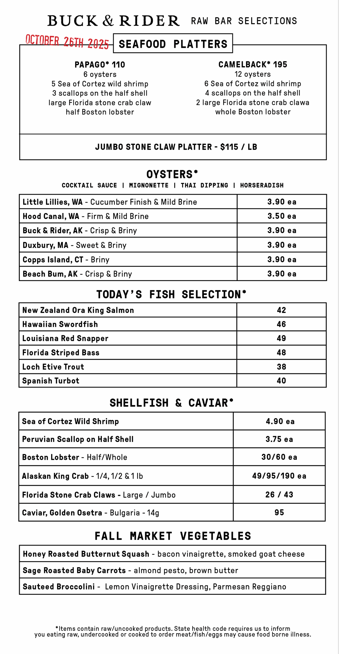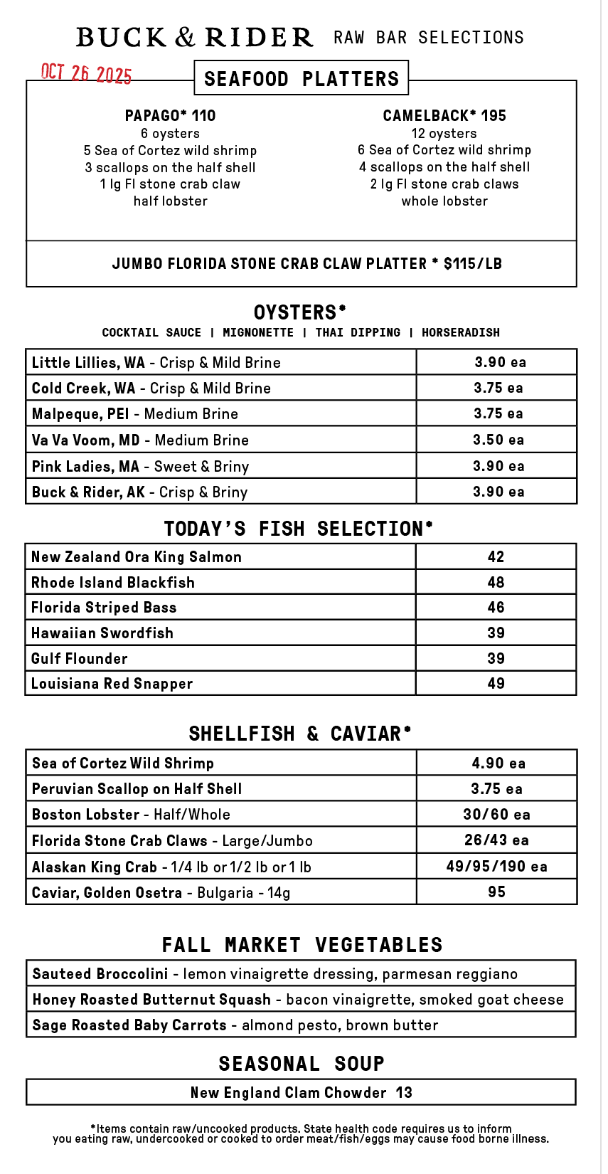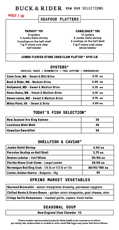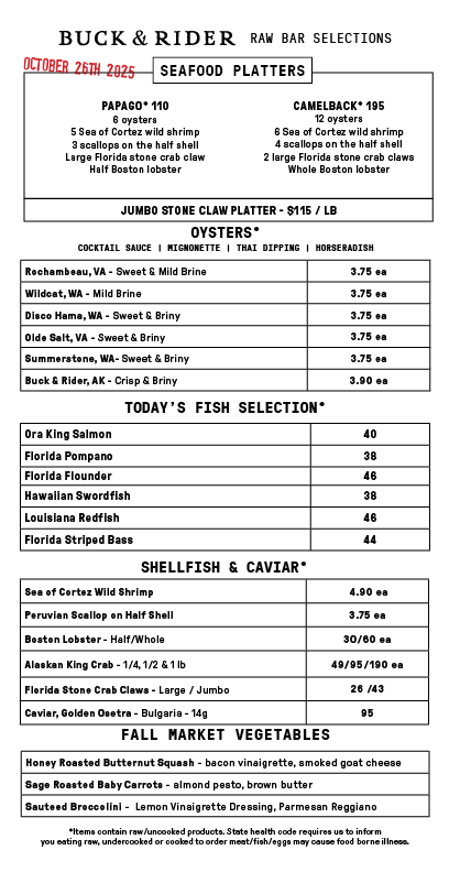 Our daily raw bar menu is time-stamped and continuously updated to reflect the freshness of our seafood and market vegetable selections.